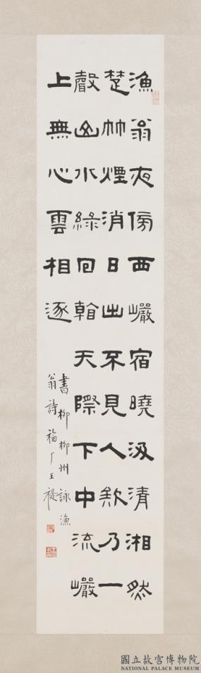 渔翁夜傍西巗宿。晓汲清湘然楚竹。烟消日出不见人。欸乃一声山水绿。回看天际下中流。巗上无心云相逐。(隶书)。书柳柳州咏渔翁诗。福厂王禔。(楷书)。