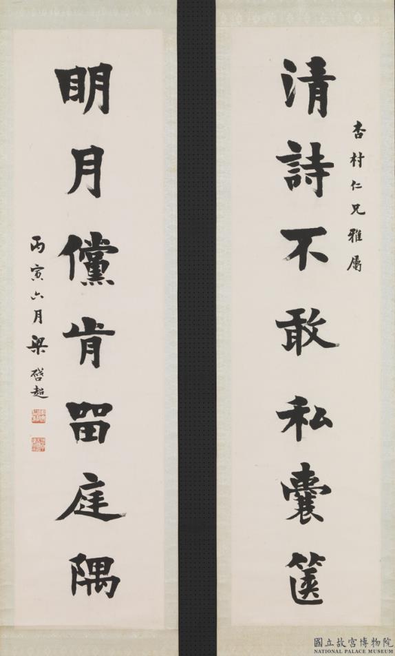 清诗不敢私囊箧。明月傥肯留庭隅。杏村仁兄雅属。丙寅(公元一九二六年)六月梁启超。