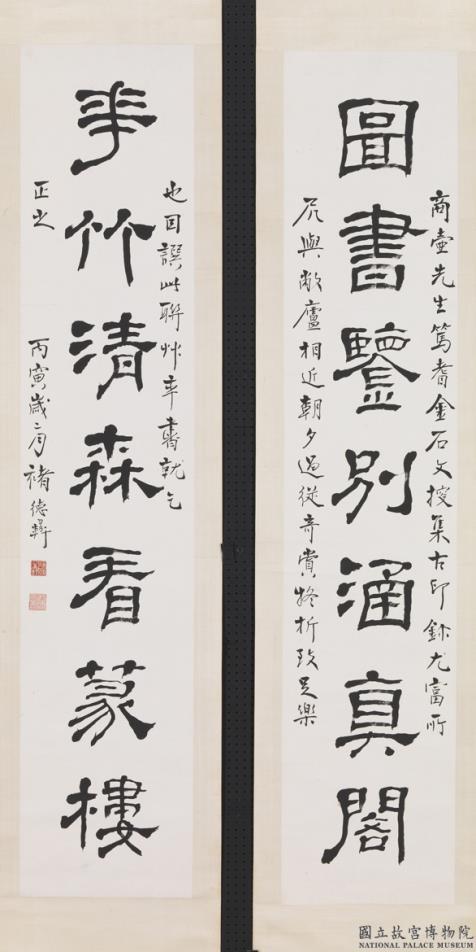 图书鉴别涵真阁。华竹清森看篆楼。(隶书)。商壶先生笃耆金石文。搜集古印鉩尤富。所居与敝庐相近。朝夕过从。奇赏疑析。致足乐也。因譔此联。草率书就。乞正之。丙寅(公元一九二六年)岁二月褚德彝。(行书)。