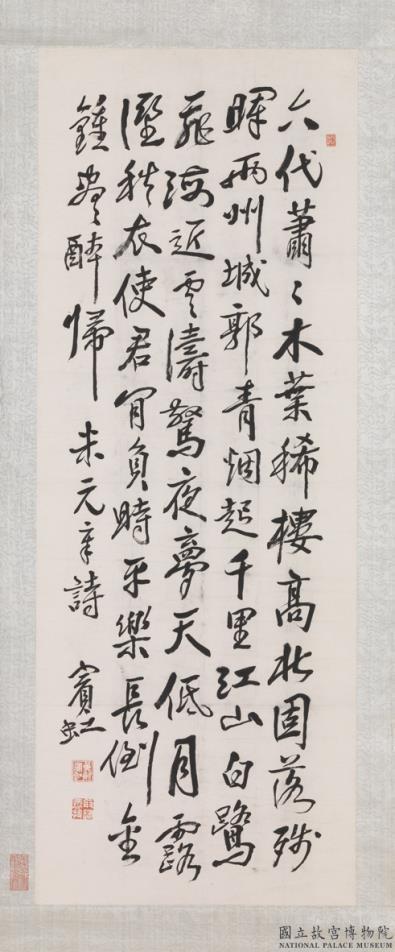六代萧萧木叶稀。楼高北固落残晖。两州城郭青烟起。千里江山白鹭飞。海近云涛惊夜梦。天低月露湿秋衣。使君肯负时平乐。长倒金钟尽醉归。米元章诗。宾虹。