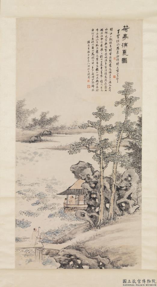 荷亭消夏图。(隶书)。王震汪琨杨逸合作。时己酉(公元一九0九年)六月望日。(行书)。