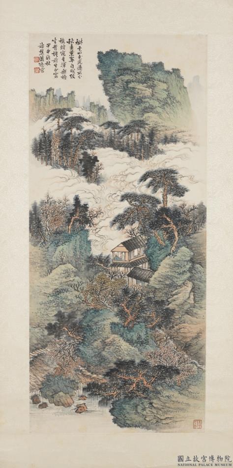 树色山色(点去)光远不分。秋来紫翠自成纹。楼头客至浑无语。坐看檐前生白云。甲申(公元一九四四年)新秋。龙樵萧愻写。