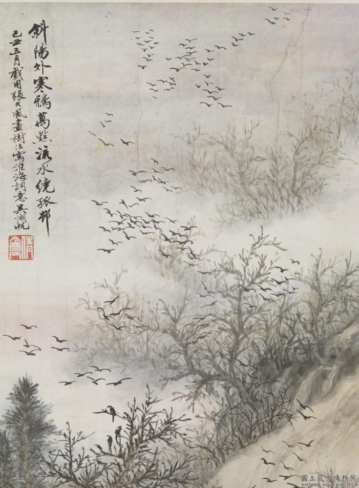 斜阳外寒鸦万点。流水绕孤邨。己丑(公元一九四九年)五月。戏用张大风画树法。写淮海词意。吴湖帆。