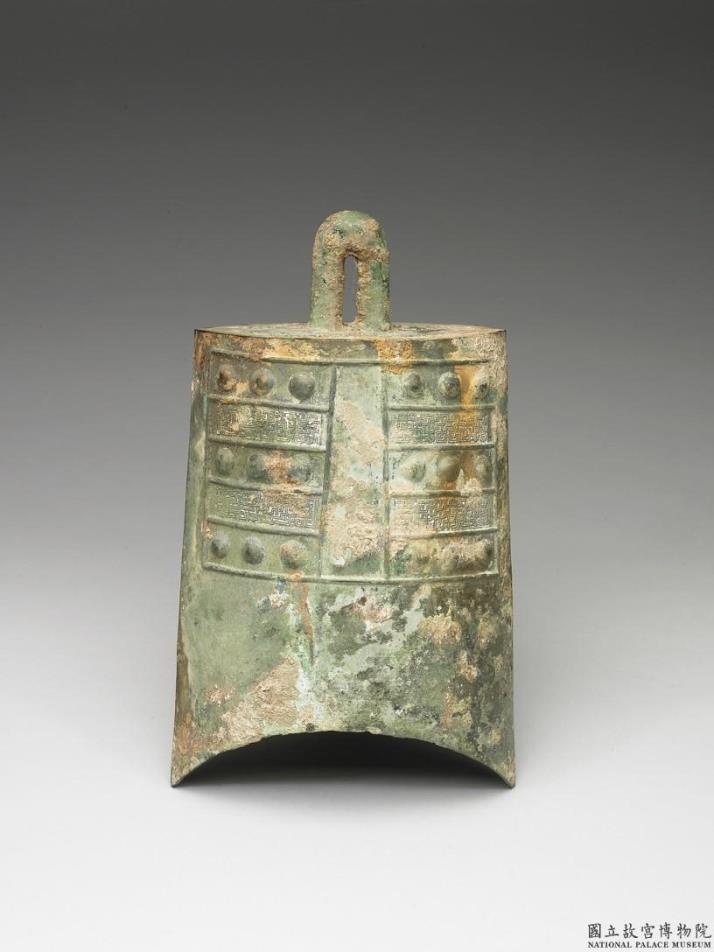 钮钟,椭圆体,半球形枚,桥形口。舞部、篆部皆饰蟠虺纹。