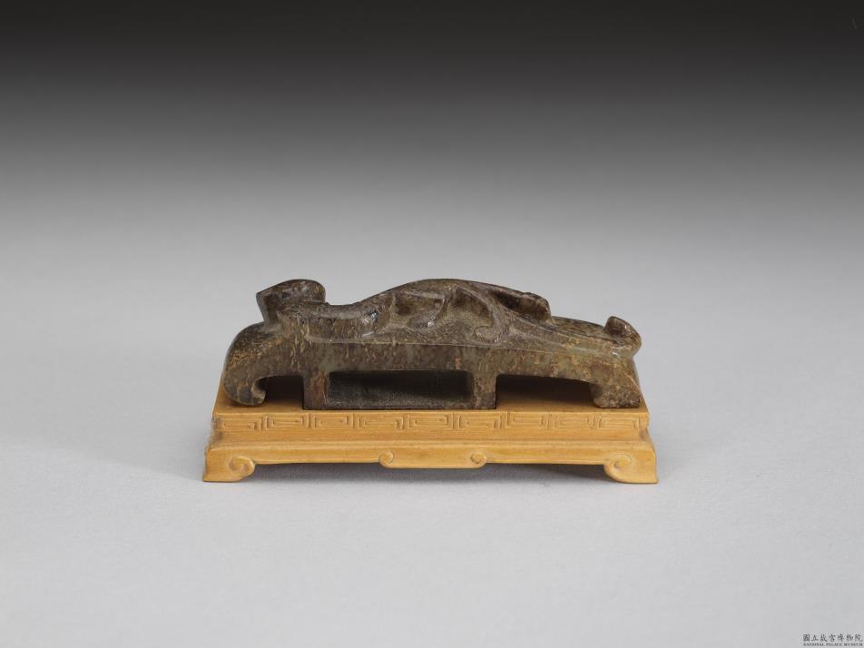 玉质,周身赭斑。方形,背有方扣。面琢蟠龙,身形扭动。附回纹木座。