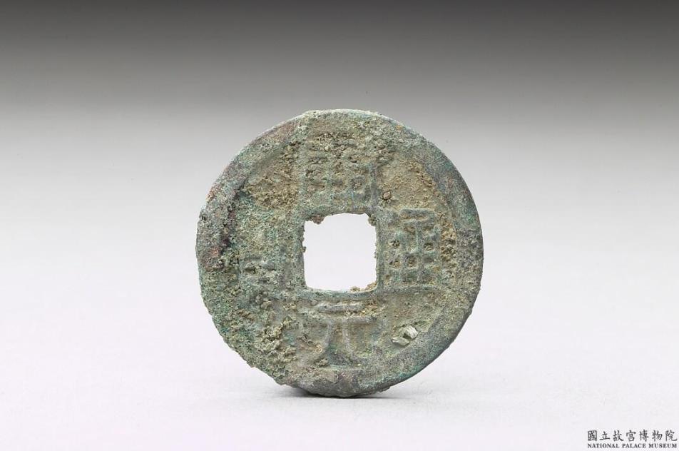 方孔圆钱,正面有楷书:「开元通宝」四字,或以为「开通元宝」四字,背面无文。