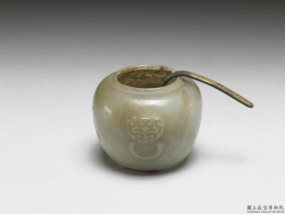 玉质,色青灰。圆口,丰肩,硕腹,深壁略下敛,外壁两侧铺首衔环耳。光素无纹。附木座、金属勺。