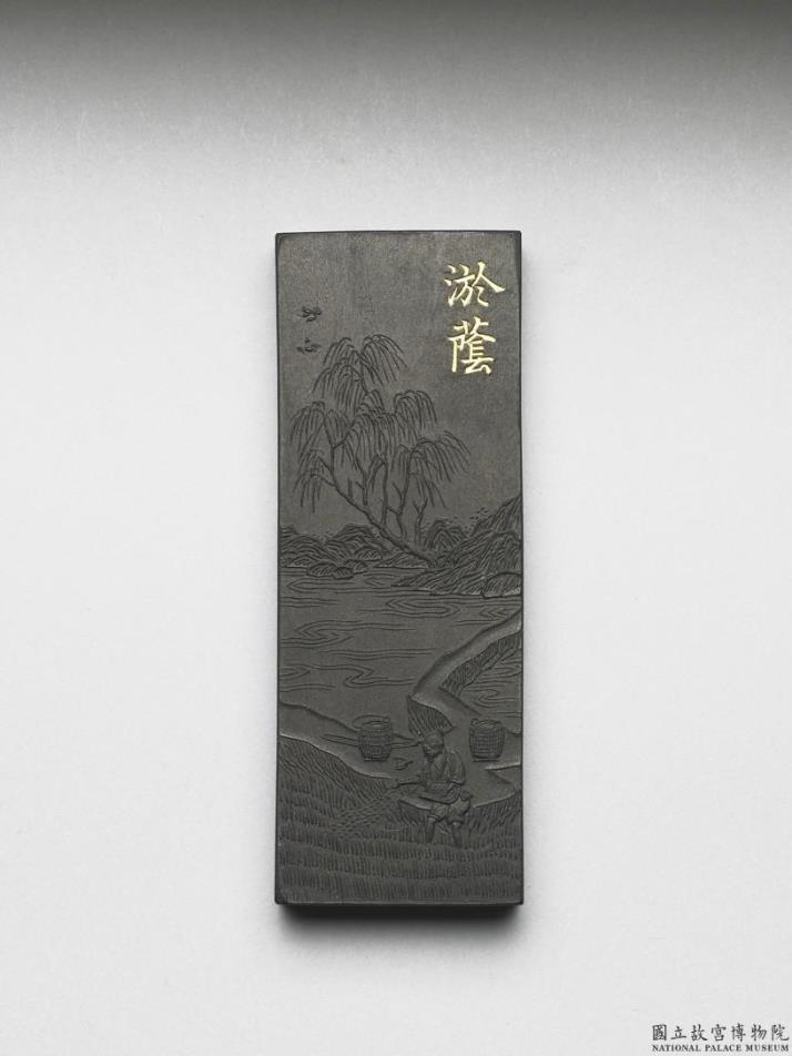 长方形墨,色深黝细腻。一面模印农人于田中施肥,旁金书「淤荫」。另一面漱金题「御诗。土化沿周礼,鸠鸣序不淆,农家无暇豫,地脉有肥硗,刈草良苗茂,洒灰短杓抛,滋生先纳垢,至理味衡茅。」御制耕图诗墨一套二十四件,共收于双龙「御制耕图诗墨」漆盒,并有锦袱。