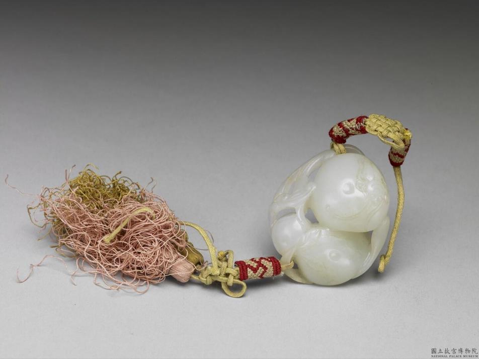 玉质,全器琢成三蘑菇,上浮雕一展翅蝙蝠。背面全玉有多处可供穿绳,上下端各系黄绦,下端另接流苏。