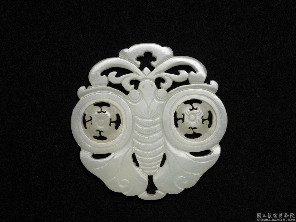 玉质,全器琢成一蝴蝶形玉牌,蝶身前翅部份以两镂空圆环取而代之,环内有变形柿蒂纹。蝴蝶两触角间与后翅间皆连有一几何形横杠,可供穿系绳子。此玉牌双面皆雕刻同样纹饰。