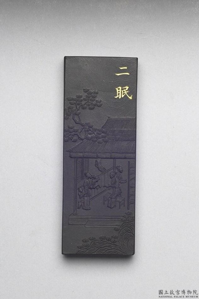 长方形墨。一面模印填金楷字「二眠」,并模印屋舍庭树,屋内人似同为家人,正享天伦,架上有蚕,以示蚕已生长至二起。另一面漱金题:「御诗。治室务精洁,初生连蚁微,布筐置槌架,移箔卷帘帏,频以柔桑饲,毋劳纎手挥,二眠须静待,色变候无违。」御制织图诗墨一套二十四件,共收于双龙「御制织图诗墨」漆盒,并有锦袱。