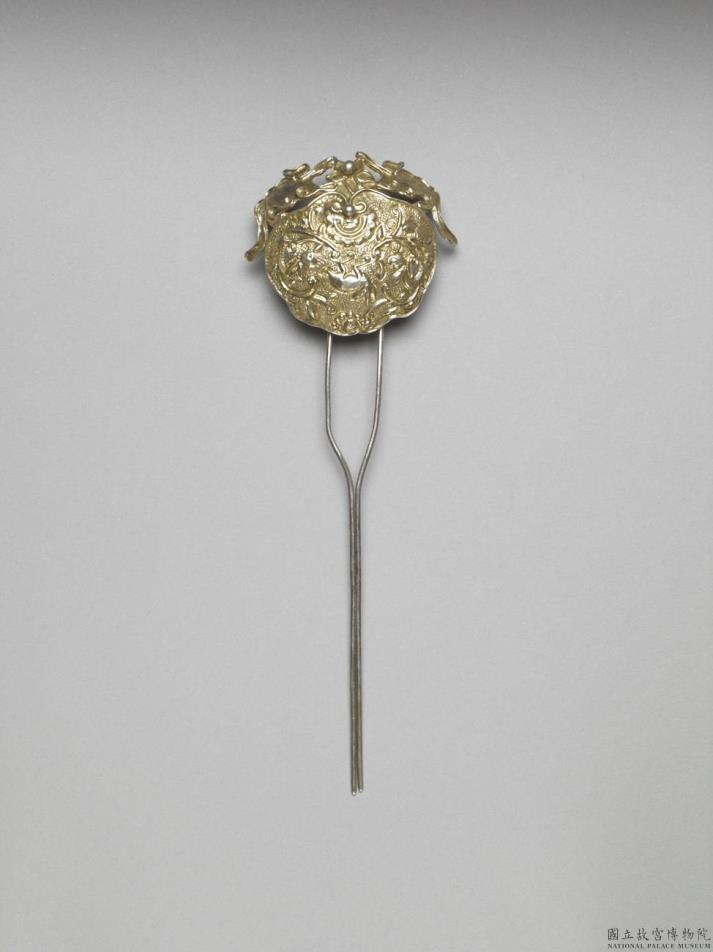发簪,银铜合金,圆形簪首,饰敲花兔子、花卉。簪挺以两股银线作Y字形。