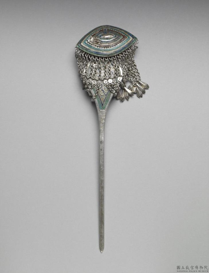 步摇,银铜合金,簪首近眼形,以银丝绕出多层条纹,各层做敲花直线纹或三角纹,中央贴饰蝴蝶纹,上方中央有一排对叶纹;片状簪挺于上端呈眼形扩大处饰折枝花卉纹,图案内填之珐琅色料有剥落现象。簪首背面下方接有一排S形银丝,垂挂炼状流苏,中央有圆形银片串连,下缀叶形及桃形坠角。簪挺上下两侧扁平细长。