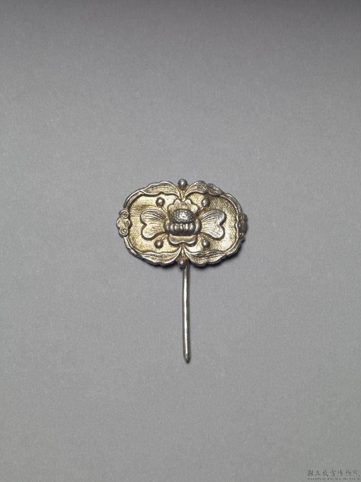 发簪,银铜合金,椭圆形簪首,以敲花为饰,中央饰朵花纹,上下围绕叶片,左右有如意云纹,图案隙地为圆点纹锦地,素圆挺。