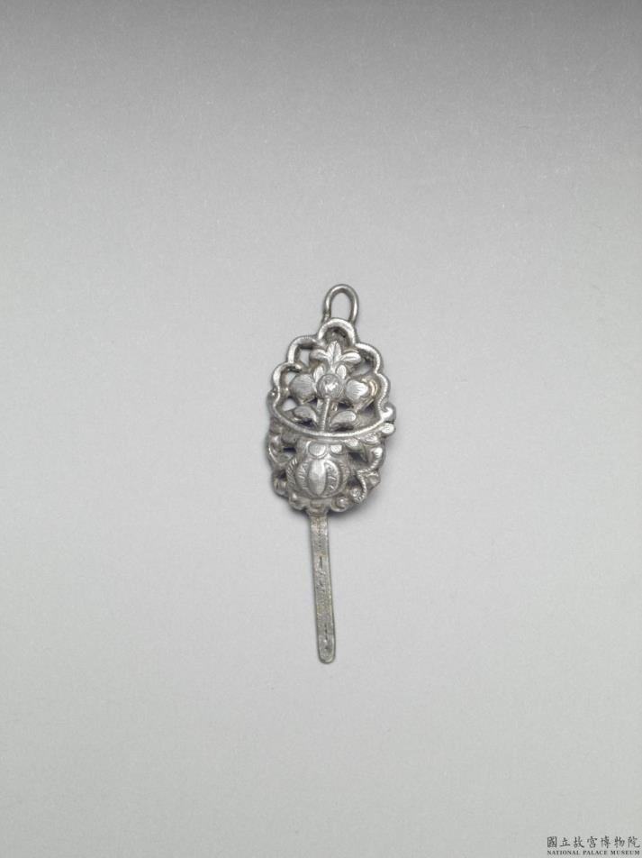 以敲花及镂空银铜合金片作花篮纹簪首,素扁长方挺,顶端有一圈环露出簪首。