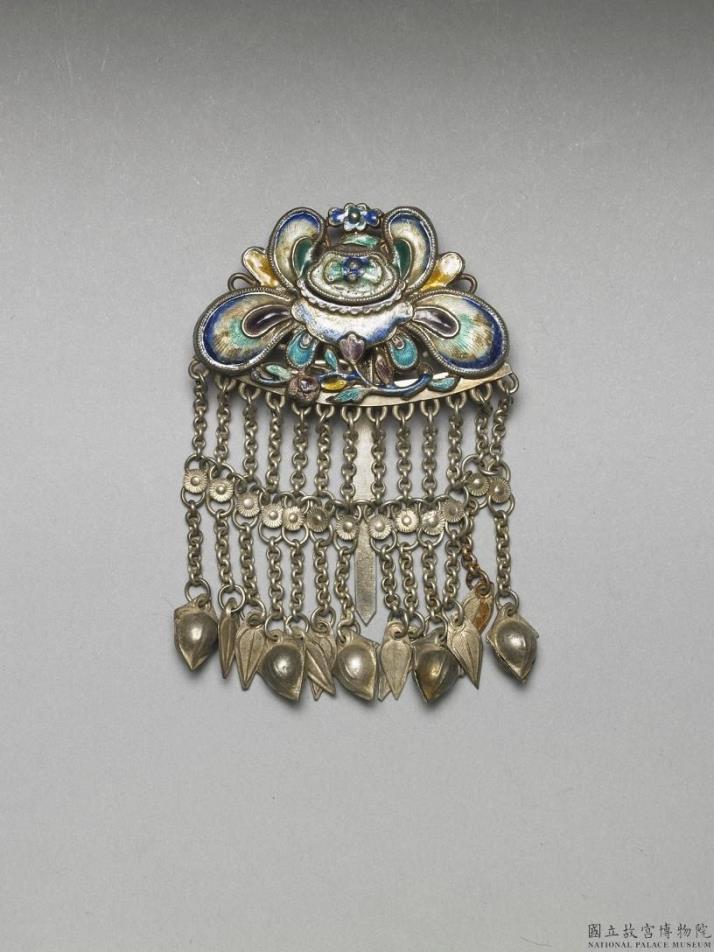 以敲花填料银铜合金片作花朵纹簪首,下接十三条由菊花形片分隔成两层的银炼流苏,尾端串有叶形或桃形坠角。素长方片状短铤。