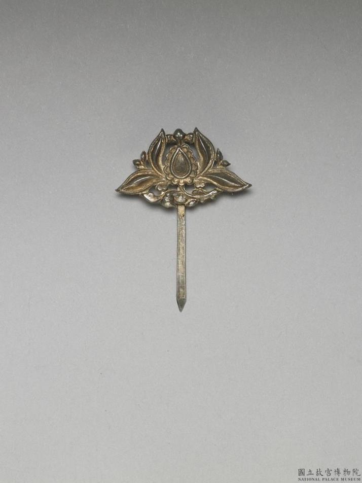 发簪,以敲花银铜合金片作莲花纹簪首,扁平素挺。