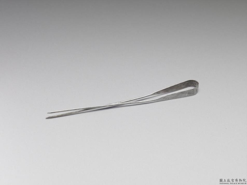 发钗,铜银合金。由一根长丝中间一段敲平呈长梭形后对折,两端尖,全器光素无纹。