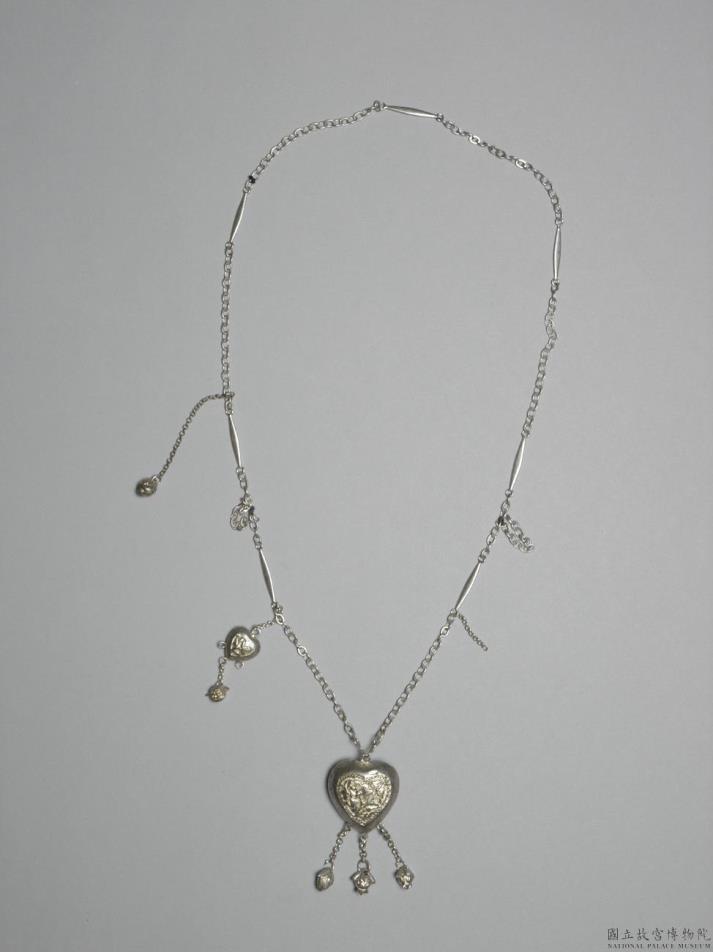 银铜合金项链,项链以小金属圆环及细长梭形金属饰件相连而成。炼上并连短小坠角,颇见细致秀气。坠饰为外鼓的心形,外壁皆有心形开光。一面开光内联珠纹地,錾饰花蝶;另一面开光内侧有「文明」二楷字。字斜,上方饰竹叶。心形坠饰并带三坠角。