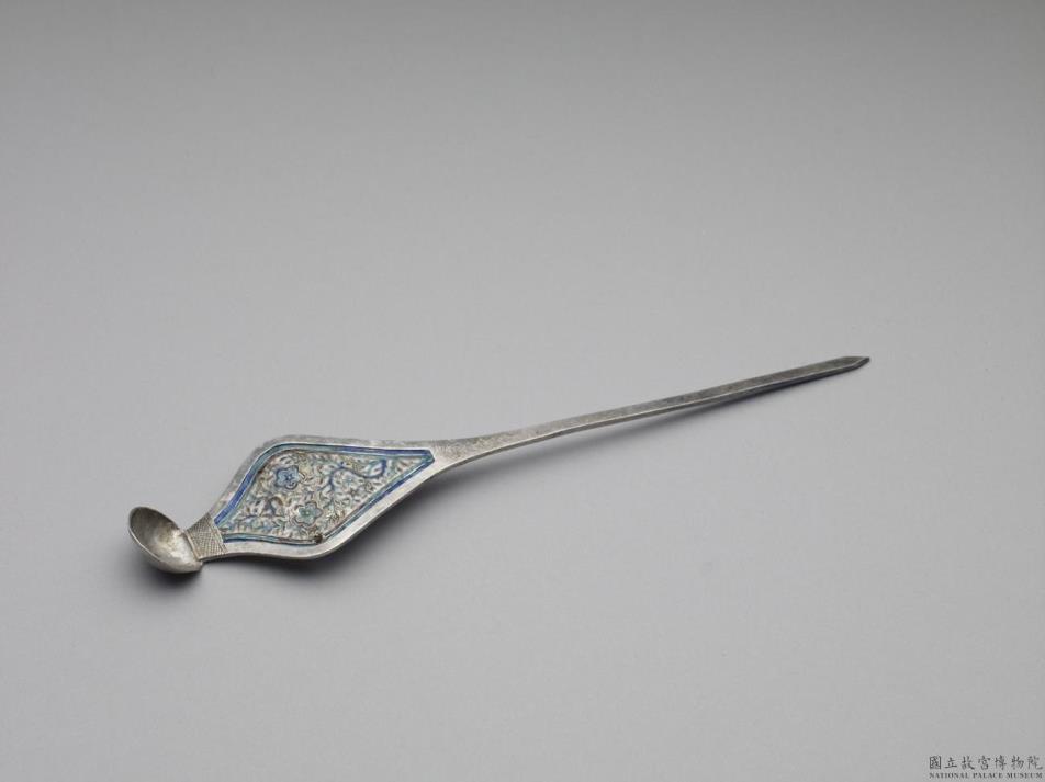 银铜合金耳挖簪,簪首近似菱形,前端为一耳挖,簪挺扁平而上宽下窄。簪首于菱形部分表面饰花叶纹,并以蓝绿色珐琅料填满。