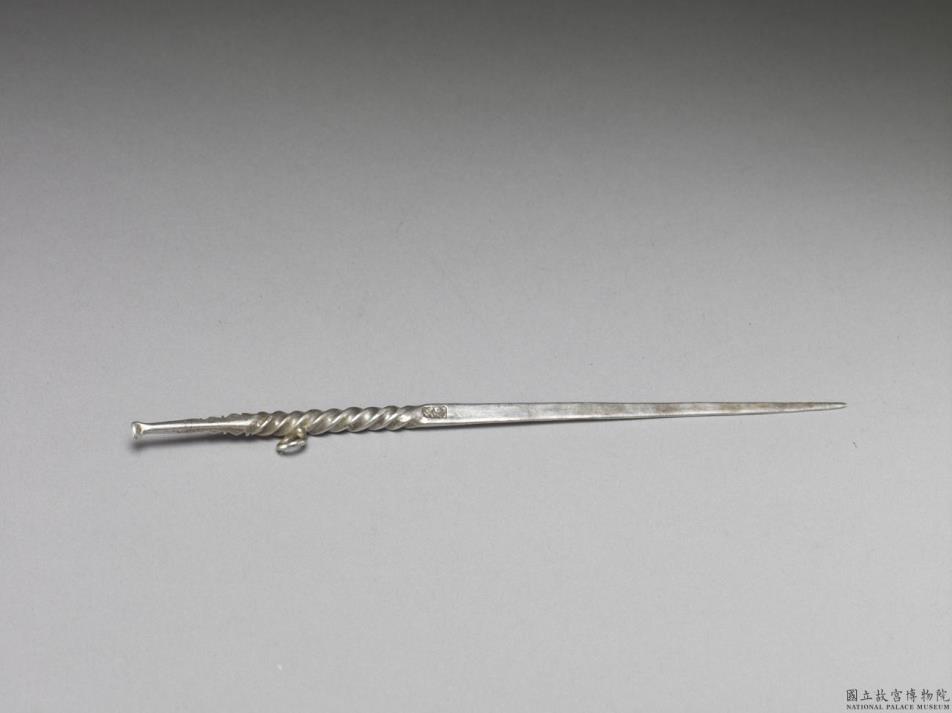 银铜合金耳挖簪,簪首顶端为一小型耳挖,首部上端带一截螺旋纹,纹饰上方竖立一圆环,底端錾刻长方框「○和」印记。挺部下端扁平而光素无纹。