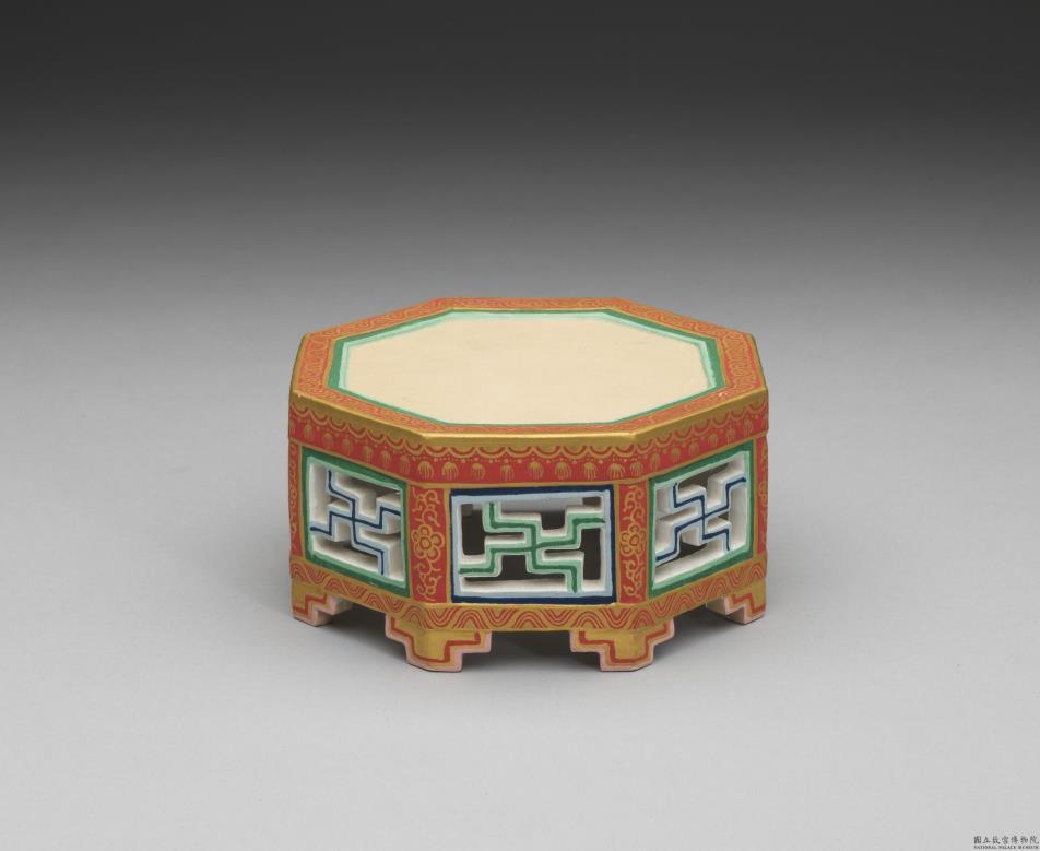 陶胎,赋彩,描金,八角坛形炉台。 胎土均匀无沙粒,火度较低,呈淡红色。八角坛的框架的部分是红布垂饰纹及梅花缠纹、波纹则用金彩表现,卍镂雕部分是使用白底绿彩、墨彩、外框架内侧卍部分的线颜色转为交互点缀。足部金彩绘逆山形的线纹,周围施粉红色线纹,器底盖「清」六角印。