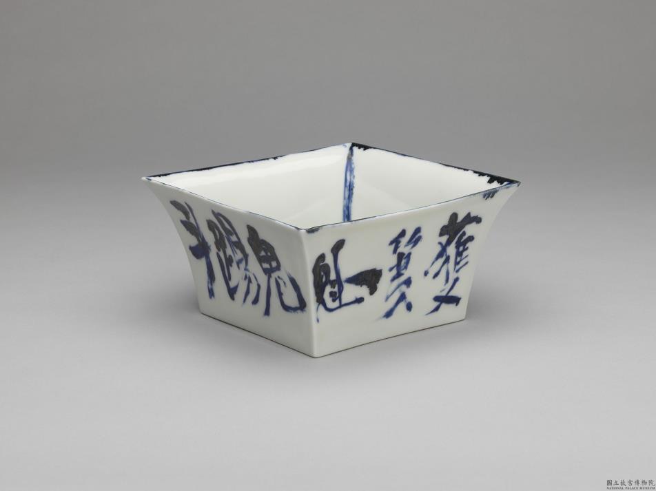 器壁以青花描绘「鬼与梅花」,并青花书画赞「获簒一魁/鬼踢斗/九襄铁斎」的四方盆(日文「升钵」)。 富冈铁斋墨书此作品图案为「魁星图」,「魁」是指北斗七星第一颗星,水勺容器的顶部;或第一颗星到第四颗星,水勺容器全部。魁星则是被神格化的星神,犹如魁字由鬼和斗组成,因此形象为鬼用左脚将北斗星踢高模样。再者,斗又指测量枡形容器,符合本器四方钵型。
