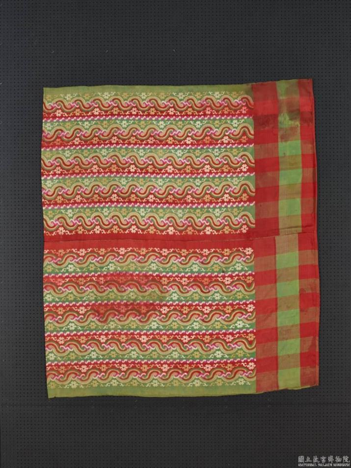 这是一件缅甸贵族妇女使用的传统缂丝筒裙,红绿两色在英国殖民之前是缅甸皇室专用的色彩。裙身装饰的连续波浪纹与小白花纹,是织工将茉莉花飘落于伊洛瓦底江连续波浪中的美丽景象,转换成缕缕丝线精工交织成纹样,为皇室女性的穿著,也是代代相传的传统服饰。 在缅甸,丝绸是珍贵的进口材料。在这件织品上可发现当时织工运用精致的缂丝工艺,使用许多不同色彩的小梭子,以「通经回纬」的技法,将纬纱织入图案,十分精细费工。