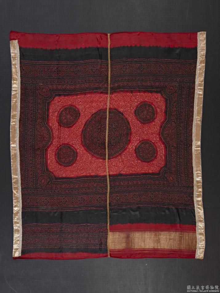扎染头巾,产自染织工艺发达的印度古吉拉特邦喀奇。头巾由兩幅布料拼接而成,布幅上布以扎染手法的小圆点呈现花草植物图纹。扎染在印度称为 bandhani,是以指尖挑起一小搓的布料再以线缠紧,染色后因扎紧处染液无法渗入,产生保留底色的小圆点。色彩以红黑搭配,头巾中央染红色区块,装饰五个大小圆形,满布以细小圆点构成的花纹,布幅兩侧织金线边框,闪烁华麗光泽,为当地女子于婚禮时配戴使用。