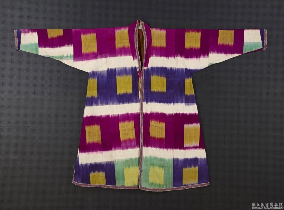 丝棉交织伊卡,内里以棉布。表布以桃红、紫、浅绿间以白色,相间成横条纹,黄色方格点缀其间,具现代简化几何风格。袍服的门襟、下襬和袖口边缘装饰以织带。