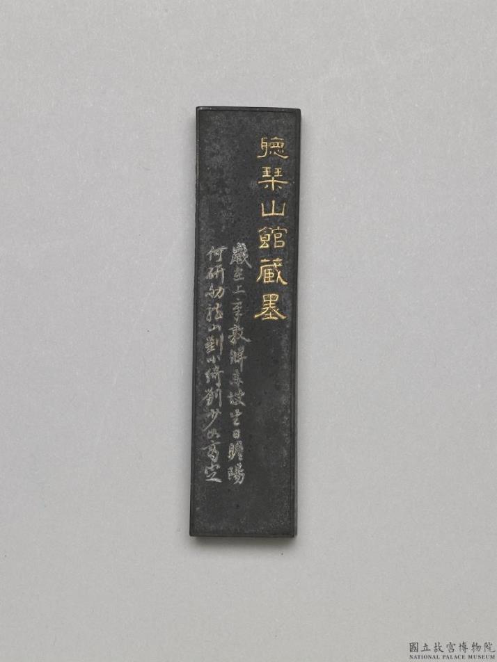 长条形墨,四边有棱,一面中央有填金立体阴文「龙香神妙」,一面有「听?山馆藏墨」、填白「岁在上年敦牂,东坡生日瞻阳。 」、「何研劬龙山 刘小绮、刘少如商定」,侧面有行体阳文「仿唐易水李氏法」。与赠文000029N000000000~赠文000029N000000002同储一木盒中。