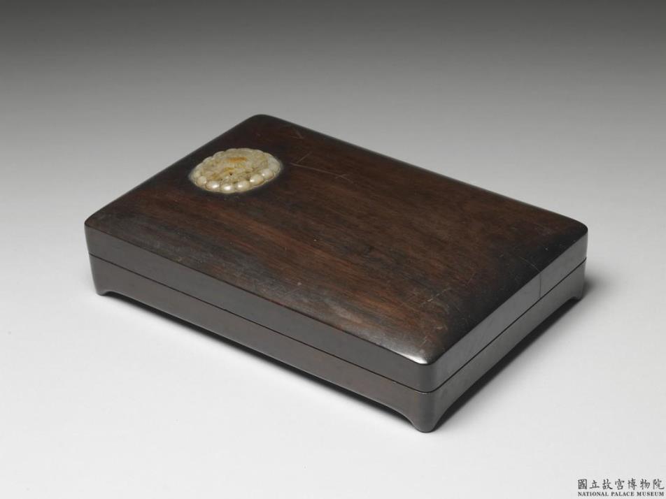 深棕色长方形砚盒,底有四足,带盖。盒盖上端嵌一白色玉,玉外缘琢连珠纹,内部镂雕一鸟禽,带长颈与尖喙,双翼展开,周遭环绕盛放莲花与叶。鸟身羽饰雕刻细腻。赠文000035端石砚板置于其中。