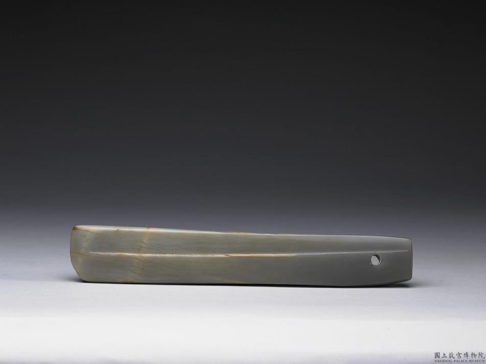玉质,玉色灰绿,并有赭沁色斑纹。全器略为长方形,圆弧形刃,斜向一边。器身下半部有一孔,一面有直向的阶段式棱。