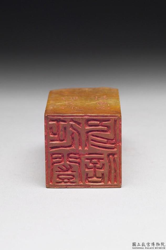 寿山石章,黄色。长方体,顶作不规则斜面,印面正方。印面阴刻「延闿印信」四字篆文。边款行书:「忆盦为组?作。」印身浅琢老松、楼阁、桥与溪等纹饰。与「组盦」石章成对。