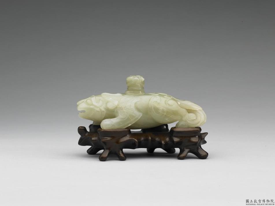 青玉,带白斑纹。全器作兽形立雕,背上有开孔为注口,有滴柱。似虎形的异兽,头上长角,作趴伏状,身上卷曲的毛发以浅浮雕表示。附木座。