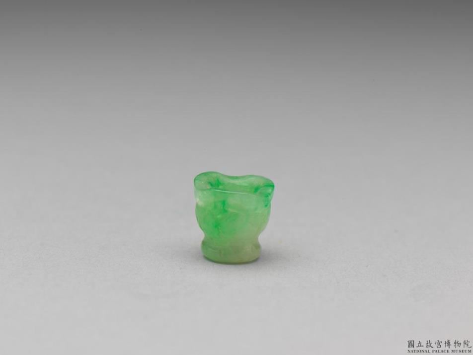 翠玉宝盖,外型略如短圆锥状体,上雕饰小叶瓣,并以简单阴线纹表现出叶脉的效果。宝盖一端挖空,可嵌饰其他小饰件,或穿系珠中。