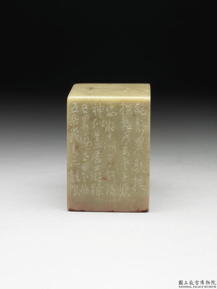 寿山石印,印面长方,颇巨,色青白,微有棕点。印面阳刻七字篆文「自诩名山足此生」。边款「自诩名山足此生,携家犹得住青城。此大千居士居青城时诗句。又云,五岳归来恣坐卧,忽惊神秀在西方。则咏峨眉句也。右诗皆题于廿余年前所写蜀川胜概画册中,今年自北美西欧瑞士雪山再过台湾,携杖属为刻铭。静农教授撰辞有云,老子婆娑游十州兮,颇得神似。盖居士游踪已略遍世界,非五岳峨青所能限。顷读辛巳蜀川画册,因摘句瑑为此石,寄呈扶桑矶子,以博一粲,或于游悰画兴不无小助欤。甲辰仲夏,壮为并识于台北玉照山房」。