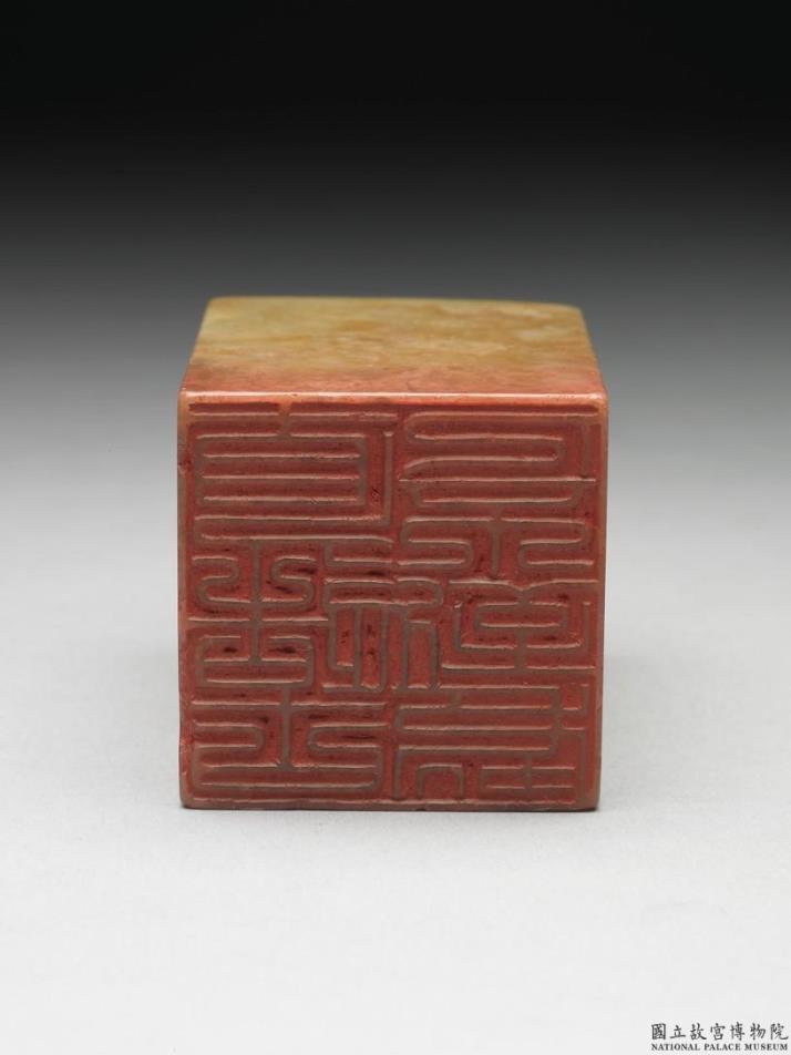 青田石章,印面方正,色青黄杂白纹。印面阳刻七字篆文「直造古人不到处」,顶款「大千八兄画法神奇,直造古人不到处。仅篆是印,以志景仰,兼为兄七十寿。戊申元月,曾绍杰呈」。