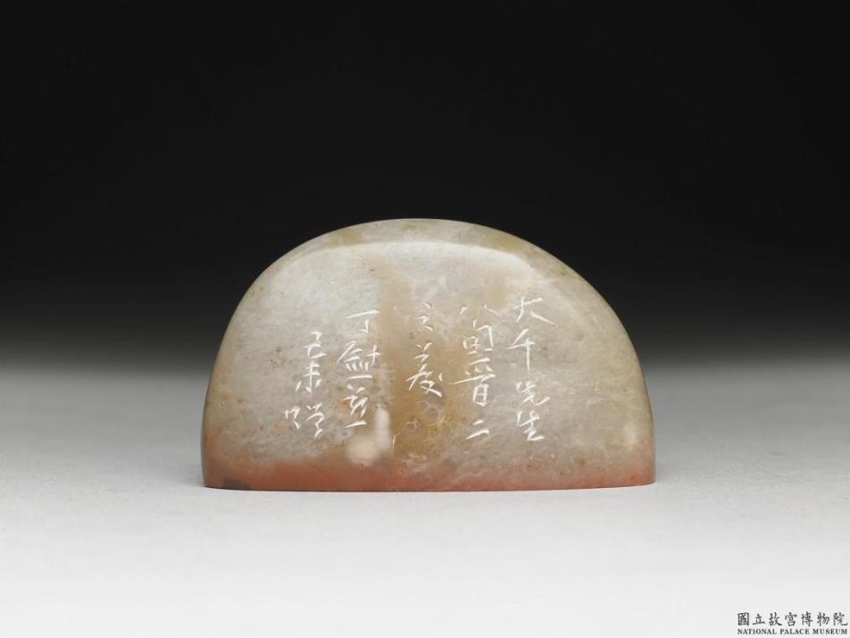 韩国石印,奇石形,印面椭圆偏长,色灰白。印面阳刻三字篆文「外双溪」。边款「大千先生八旬晋二之庆。丁慰慈己未赠。石仙刻」。