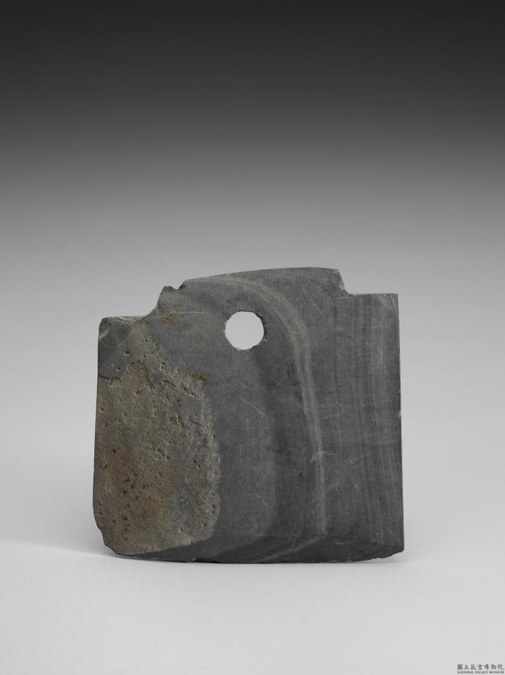 灰色,有纹理。对称梯形,中型,器体中间微厚,两侧略斜薄,表面磨平,未见抛光现象;斜弧顶,顶缘磨饰过,两端作凹肩,肩面经磨饰,一肩有崩伤;平刃,中锋(双面刃),刃线尚称清楚,刃缘多处大小不一的崩伤(使用伤),大多属旧伤。一孔略小,单面钻孔,孔底缘不整齐,孔壁旋纹尚称清楚。