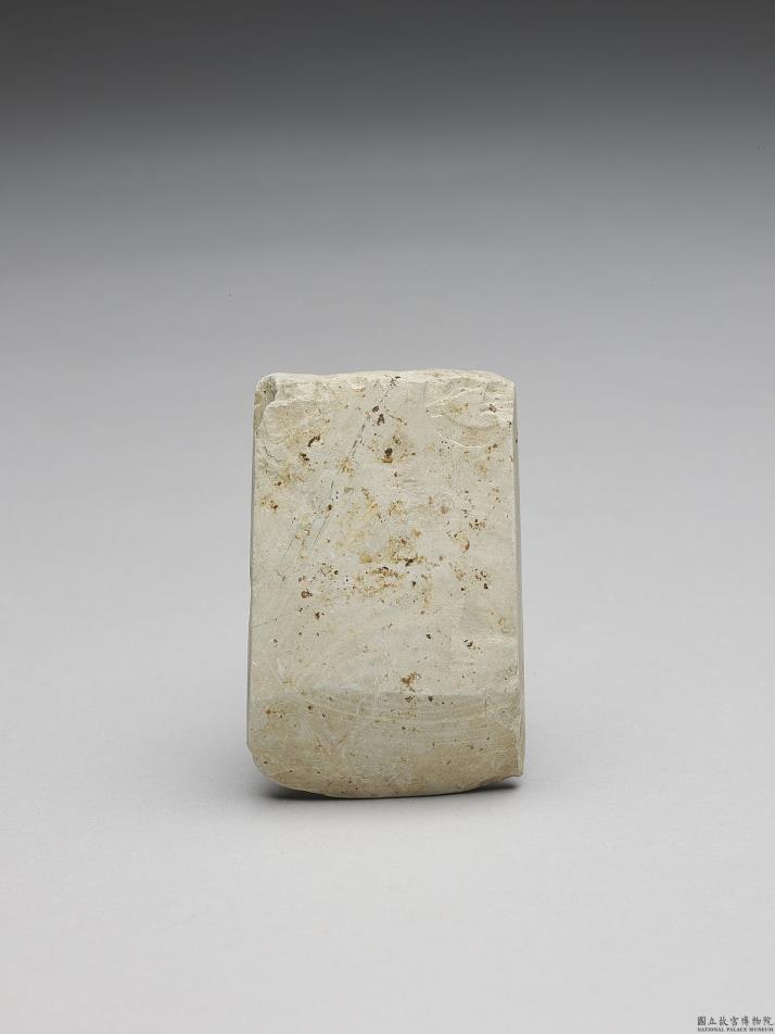 对称梯形,小型,器体扁厚,四边切割尚称整齐,背面平整微鼓,有几处打剥痕,正面微鼓,不甚平整,无段,器一侧平整,另一侧有一处较明显的打剥痕,全器器表抛磨光滑;平刃微弧,偏锋,刃缘有一些小伤。