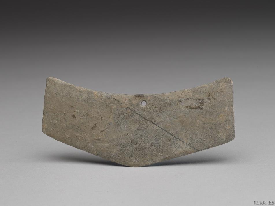 细的白沙点灰色,表面风化较严重。菱角形,小型,器体扁薄,表面平滑,惟全面风化成均匀的土灰色;凹弧顶,中间下方钻一小孔,顶缘基本上磨浑;两边折刃,刃线模糊,刃缘磨饰精细,见不到任何崩伤或使用伤;一孔甚小,两面对钻,孔壁亦经风化成土灰色。